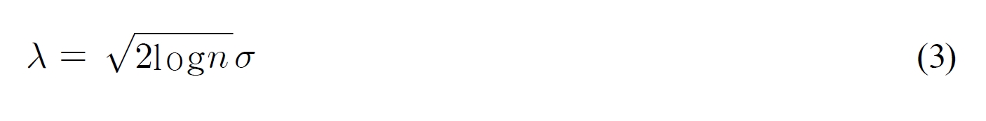 식 (1)과 식(2)에서의 람다는 임계 기준값이며 뮤는 Wavelet 계수다. 두 가지의 경우에서 임계 기준값인 람다는 노이즈 제거 과정에서 큰 영향을 끼치는 중요한 요소다. 임계 기준값 람다는 식 (3)과 같이 결정하게 되며, 식 내의 쎄타와 n은 각각 노이즈를 제거하고자 하는 데이터의 표준편차 값과 샘플 개수를 의미한다.