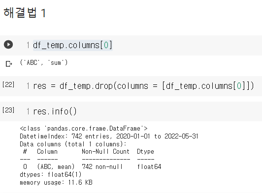 info()에서 봤듯, 칼럼네임이 ( , ) 처럼 튜플형식으로 변해서 발생하는 에러라고 생각을 했는데